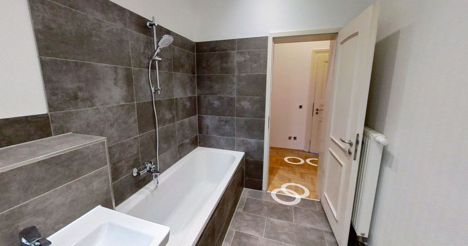 • Exklusives Badezimmer: Stilvolle Fliesen, Badewanne und angenehme Fußbodenheizung sorgen für höchsten Komfort