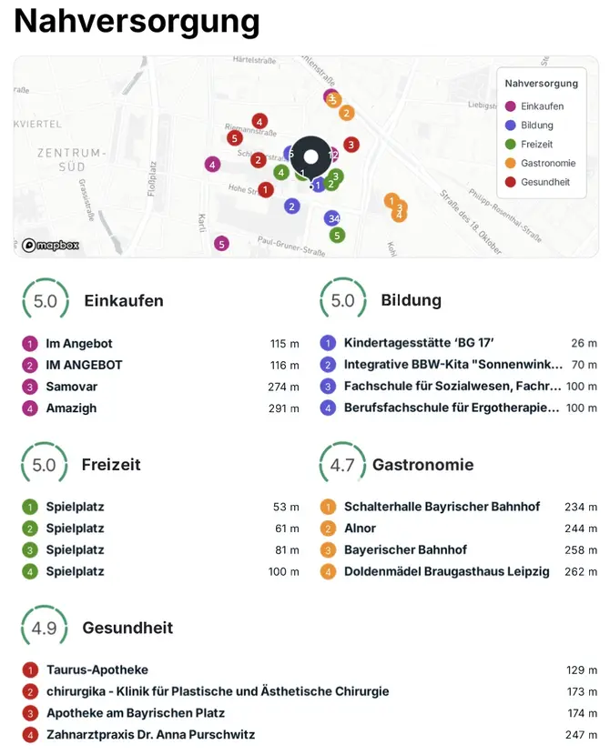 Die Wohnung befindet sich im gefragten Zentrum-Süd von Leipzig, einem Stadtteil, der urbanes Lebensgefühl mit hoher Wohnqualität verbindet. Die Innenstadt ist nur ca. 1,3 km entfernt und schnell zu Fuß, mit dem Rad oder öffentlichen Verkehrsmitteln erreichbar. Die Universität Leipzig befindet sich ebenfalls in unmittelbarer Nähe, was die Wohnung besonders attraktiv für Studenten und Universitätsangehörige macht.