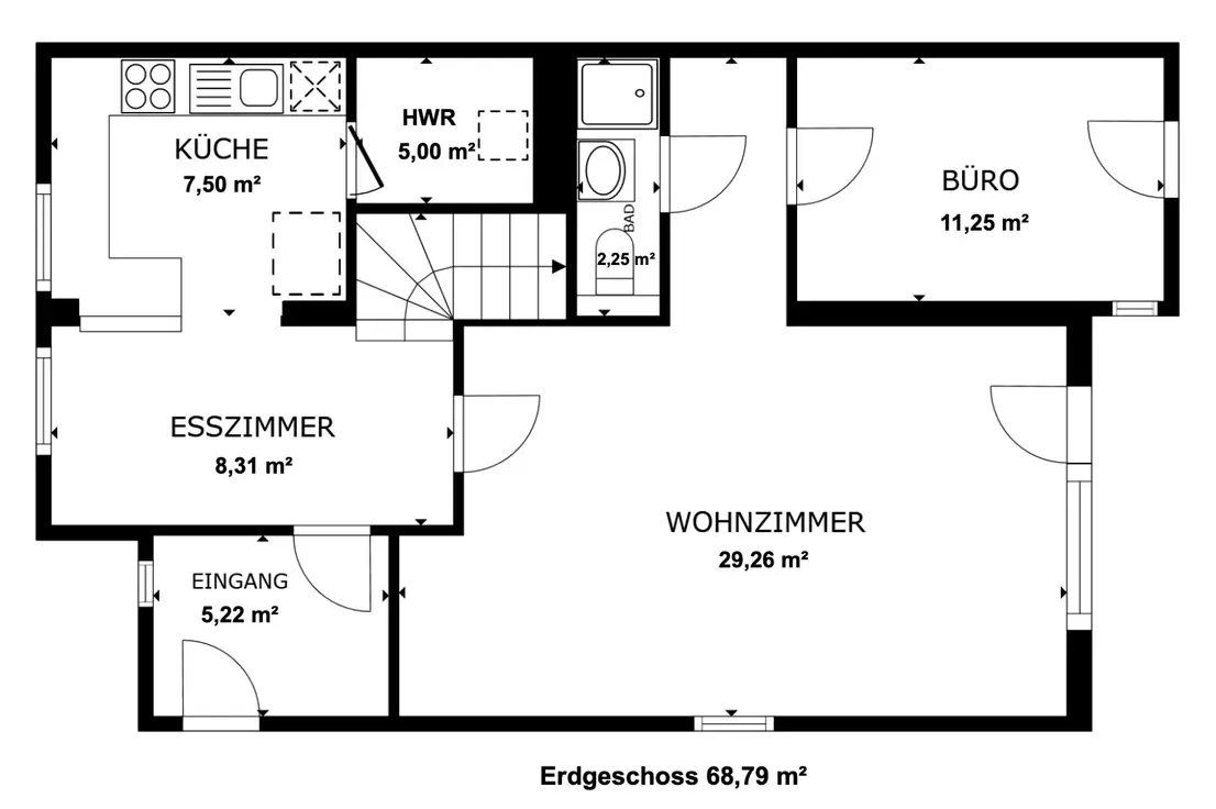 Die Raumaufteilung ist auf modernes Wohnen ausgelegt. Im Erdgeschoss befinden sich die zentralen Wohnbereiche, im